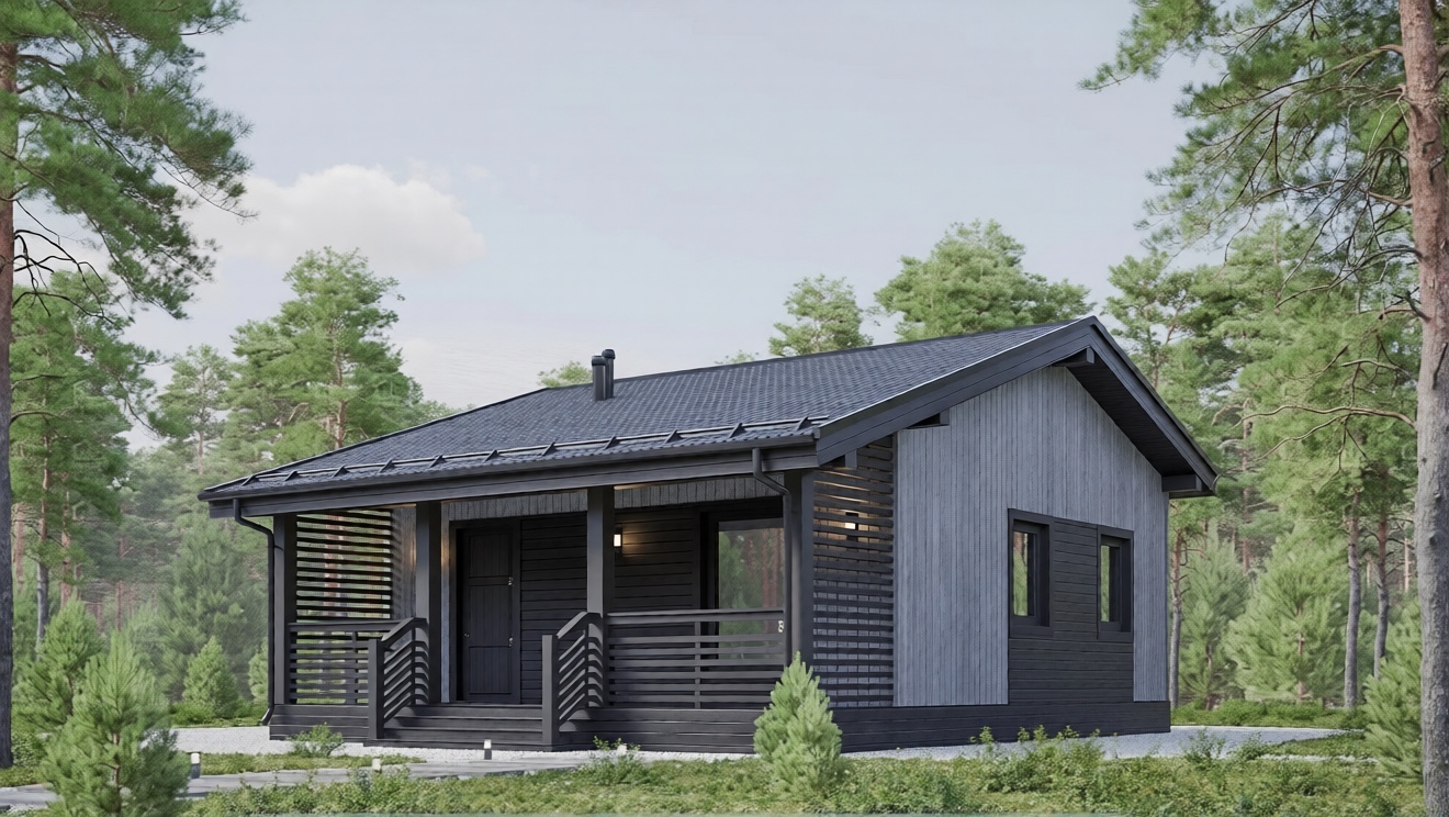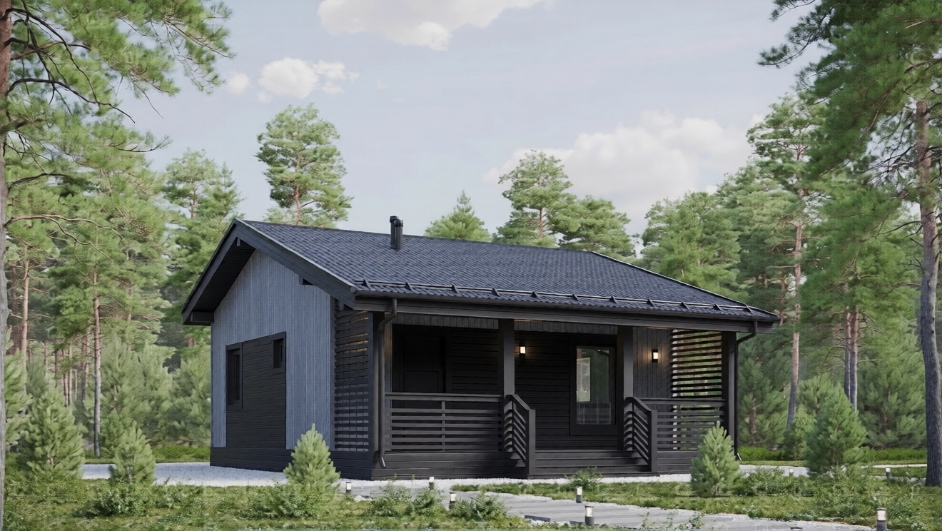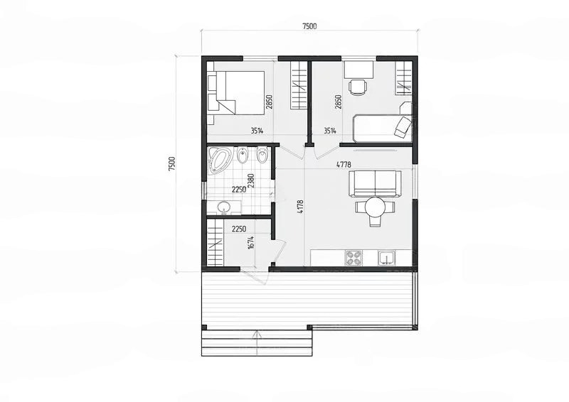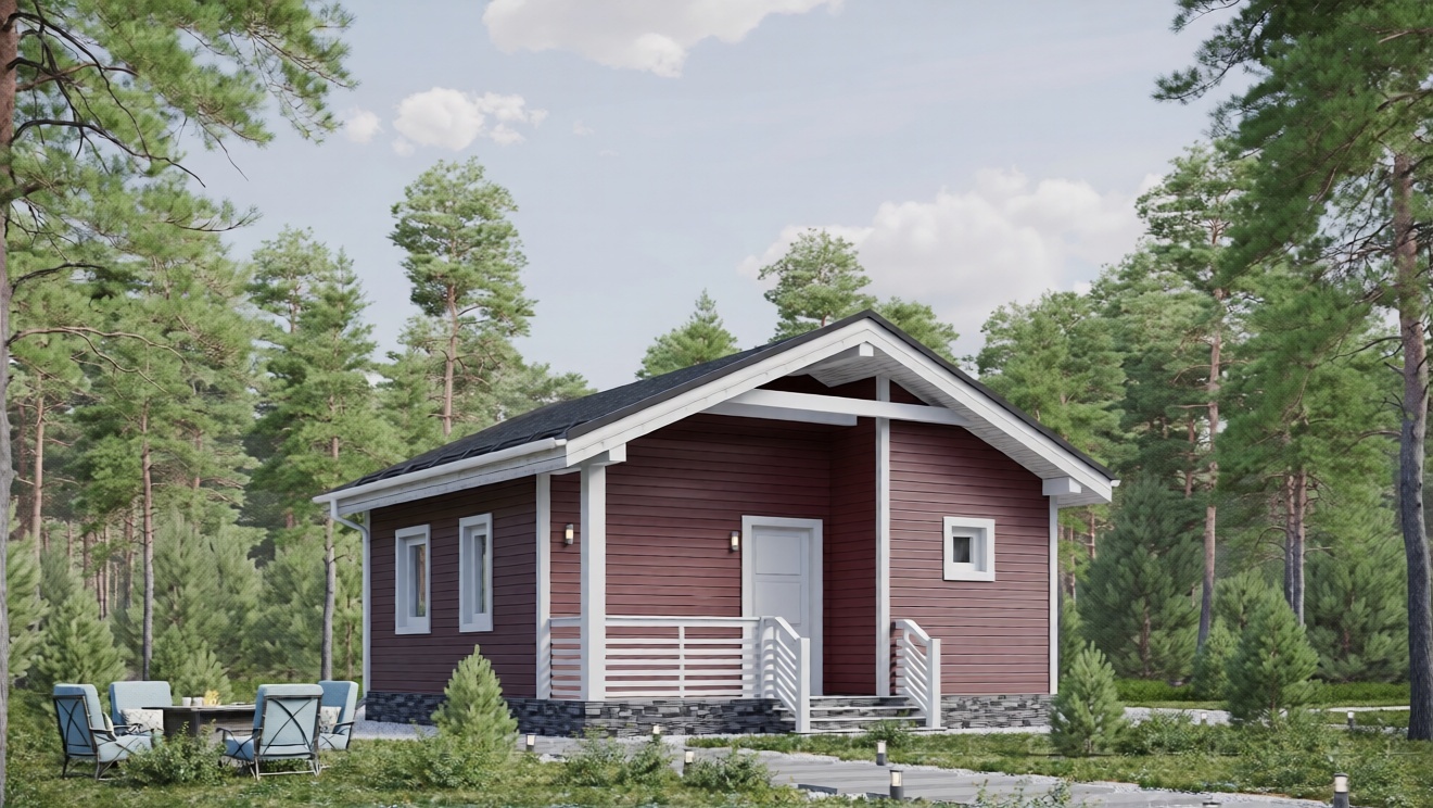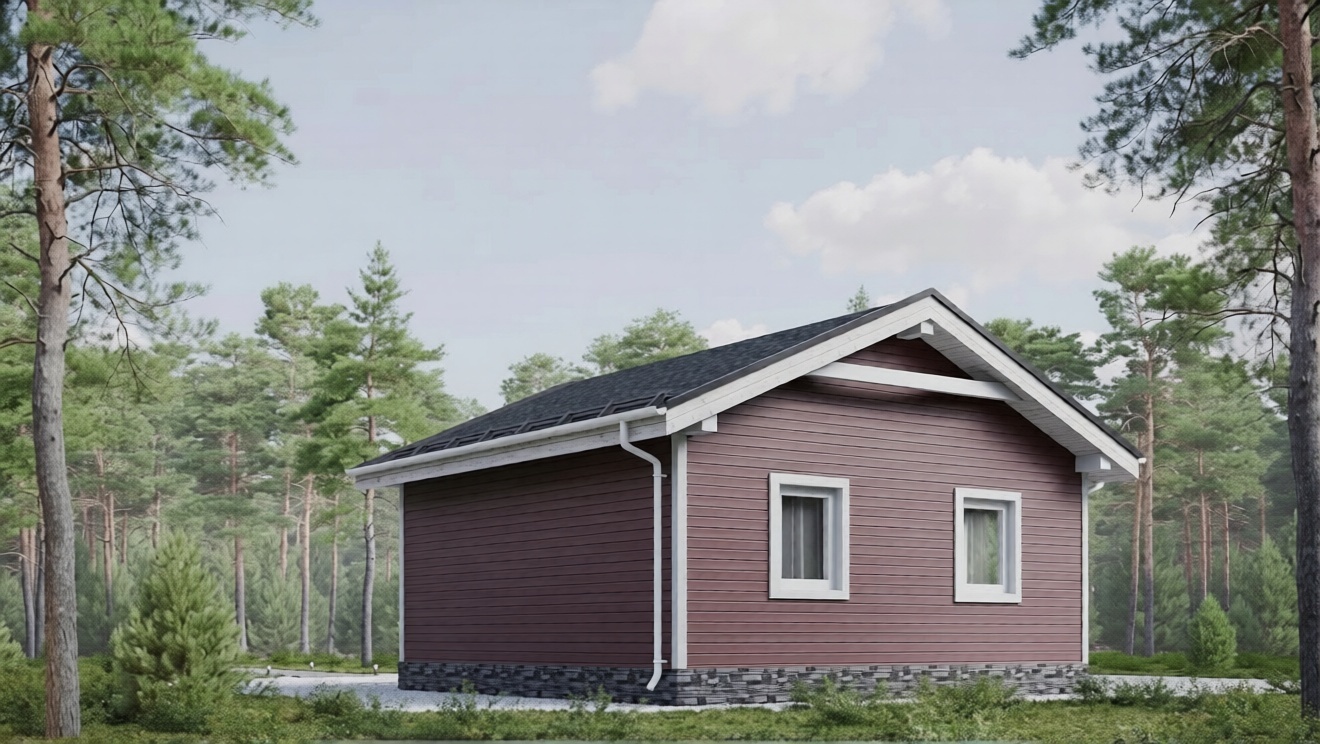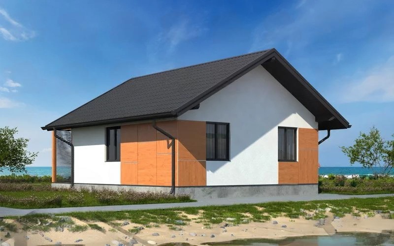 Проект Дачный Общая площадь: 47 м² Жилая площадь: 36 м² Размер дома: 6,9 х 6,9 Высота потолка: 2,8 м Фундамент: плита Конструктив стен: несъемная опалубка 300 мм Утепление: внутреннее 50 мм внешнее 100 мм Толщина бетона: 150 мм Фасад: декоративная штукатурка (мокрый фасад)