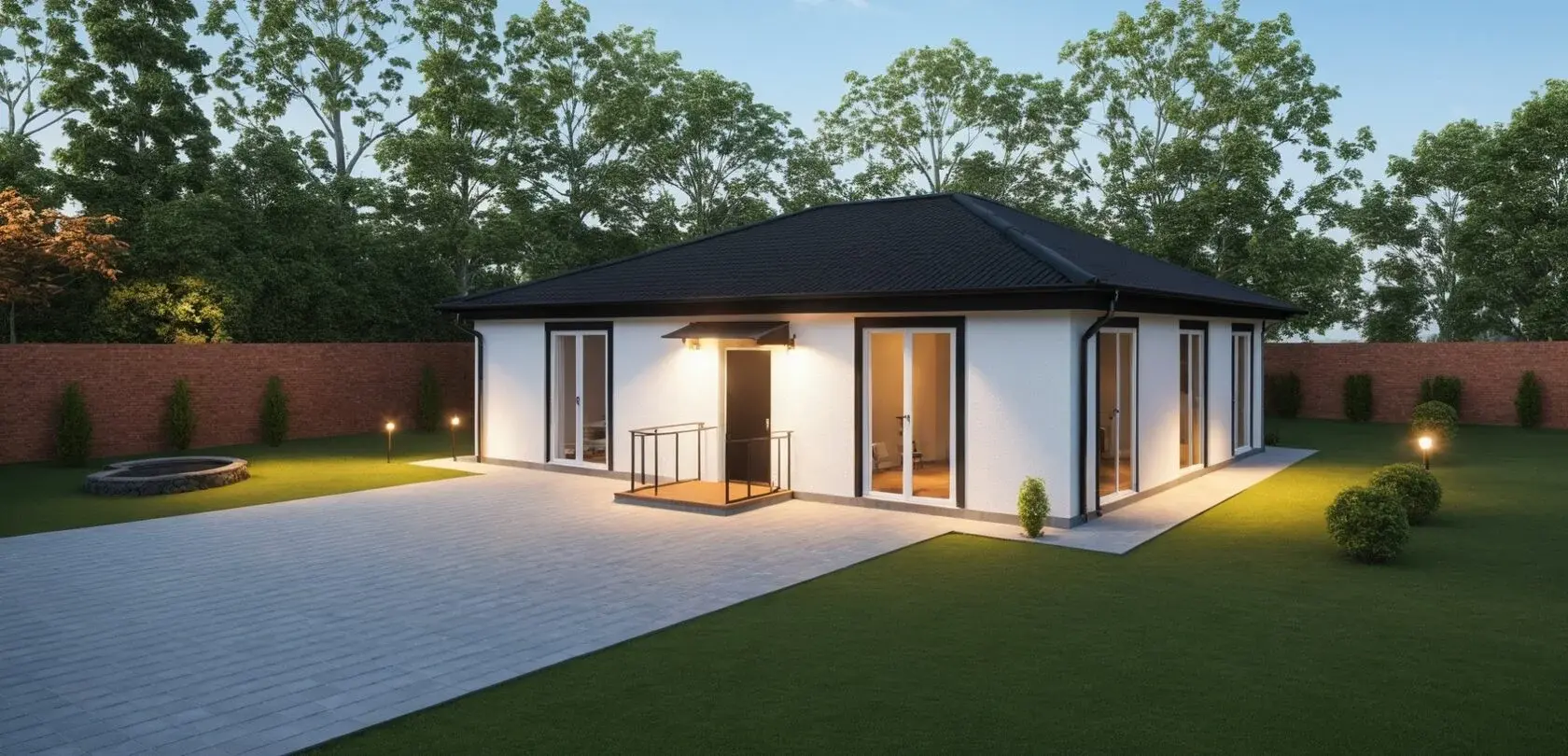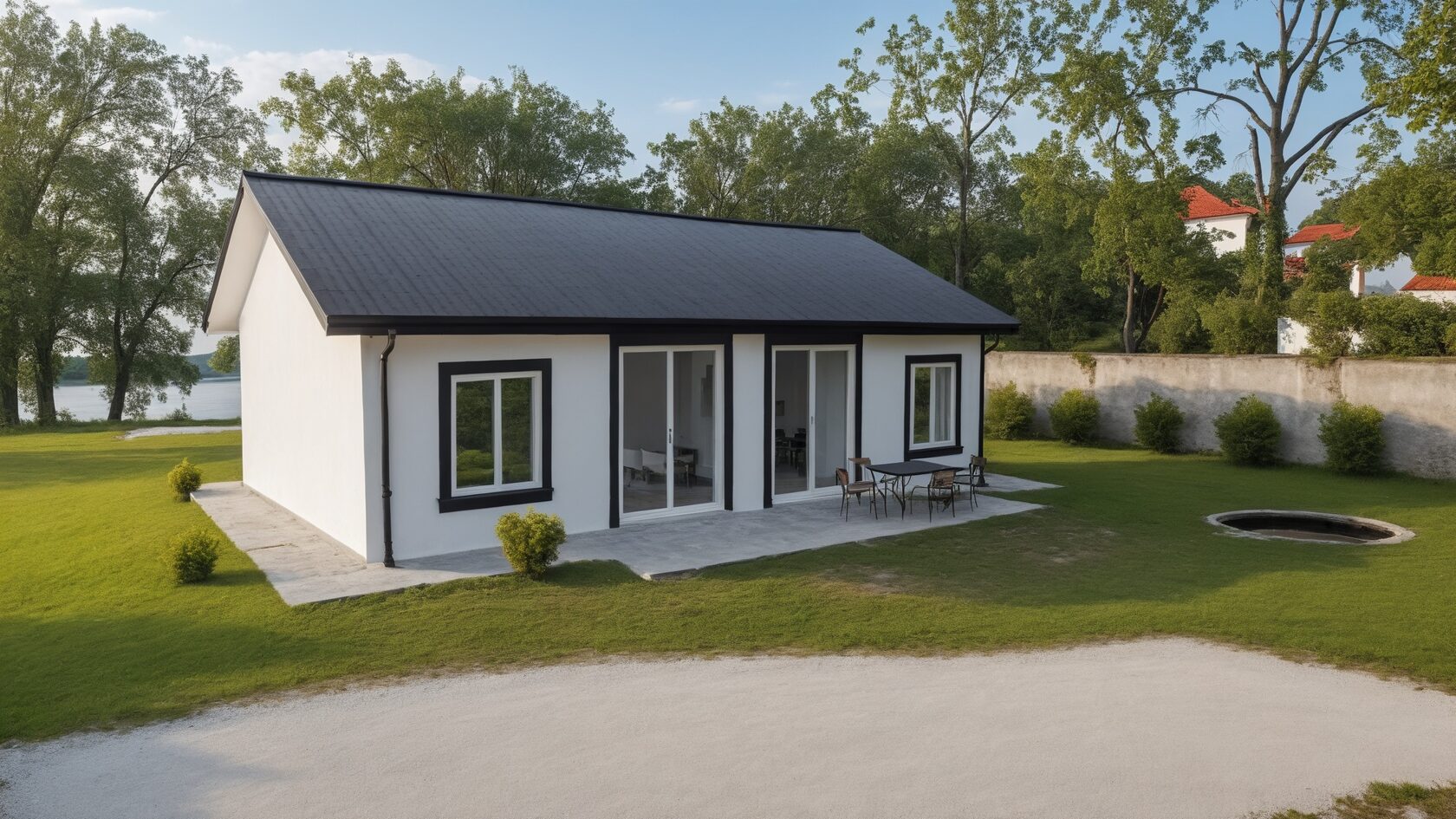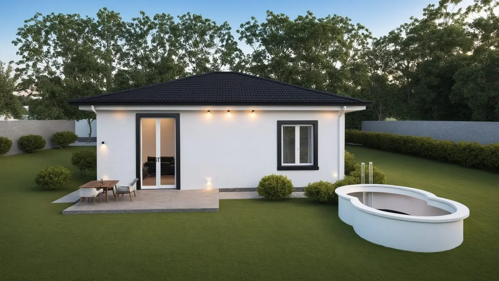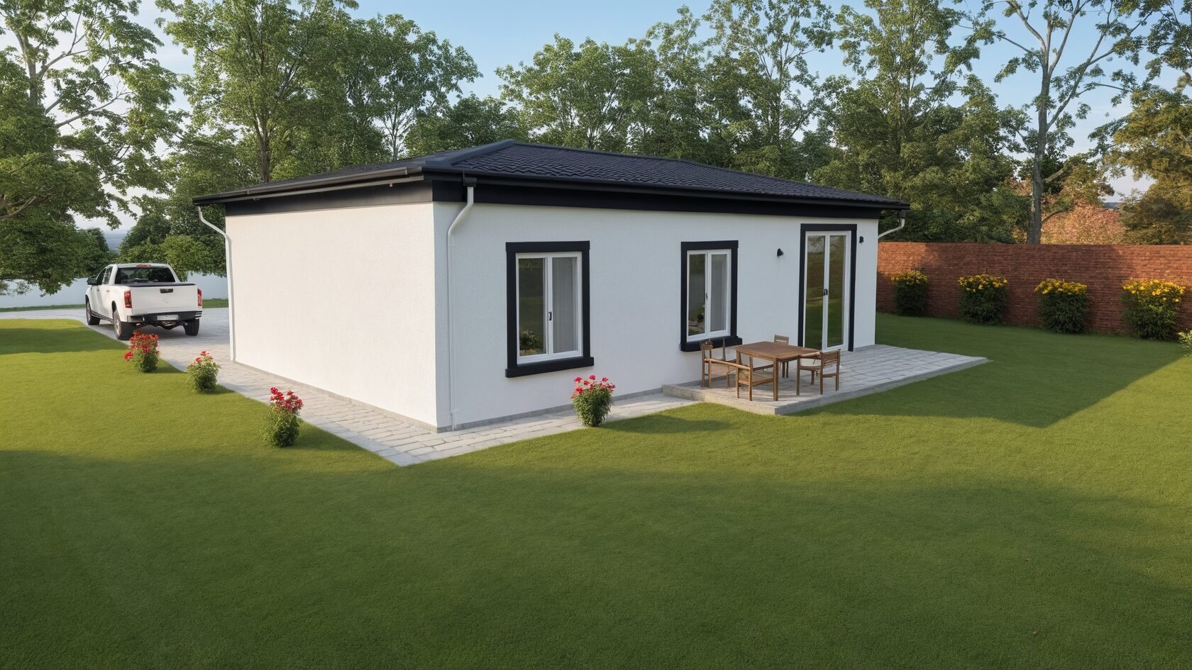 Проект Дачный Общая площадь: 47 м² Жилая площадь: 36 м² Размер дома: 6,9 х 6,9 Высота потолка: 2,8 м Фундамент: плита Конструктив стен: несъемная опалубка 300 мм Утепление: внутреннее 50 мм внешнее 100 мм Толщина бетона: 150 мм Фасад: декоративная штукатурка (мокрый фасад)