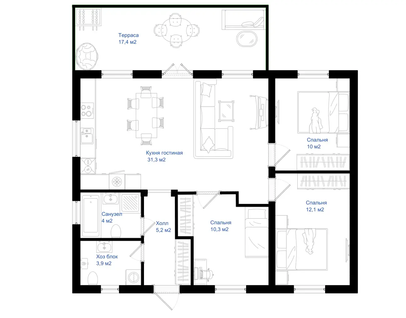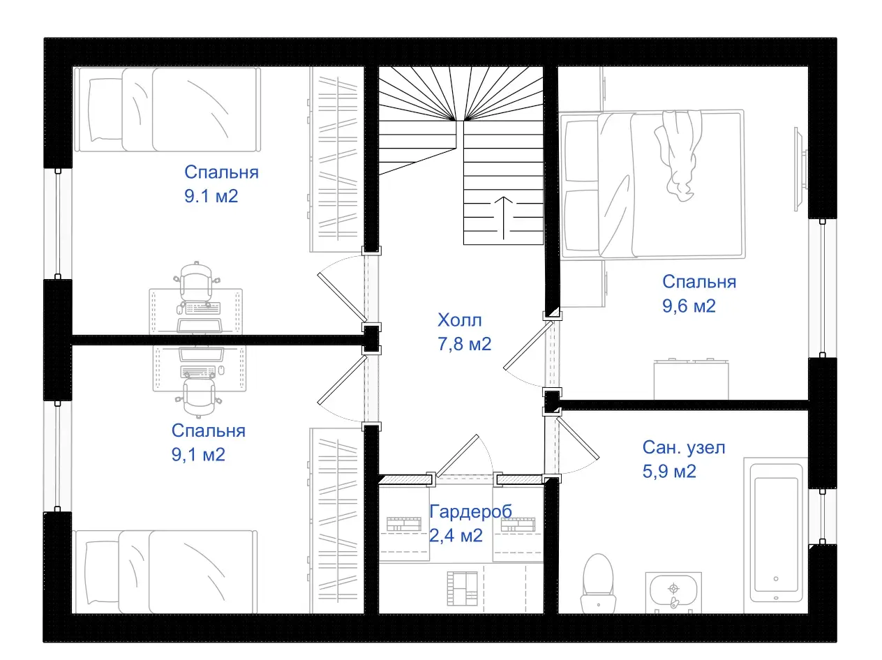 Волга Общая площадь: 111 м² Жилая площадь:78,2 м² Размер дома: 9,4 х 11,88 Высота потолка: 2,8 м Фундамент: плита Конструктив стен: несъемная опалубка 300 мм Утепление: внутреннее 50 мм внешнее 100 мм Толщина бетона: 150 мм Фасад: декоративная штукатурка (мокрый фасад)