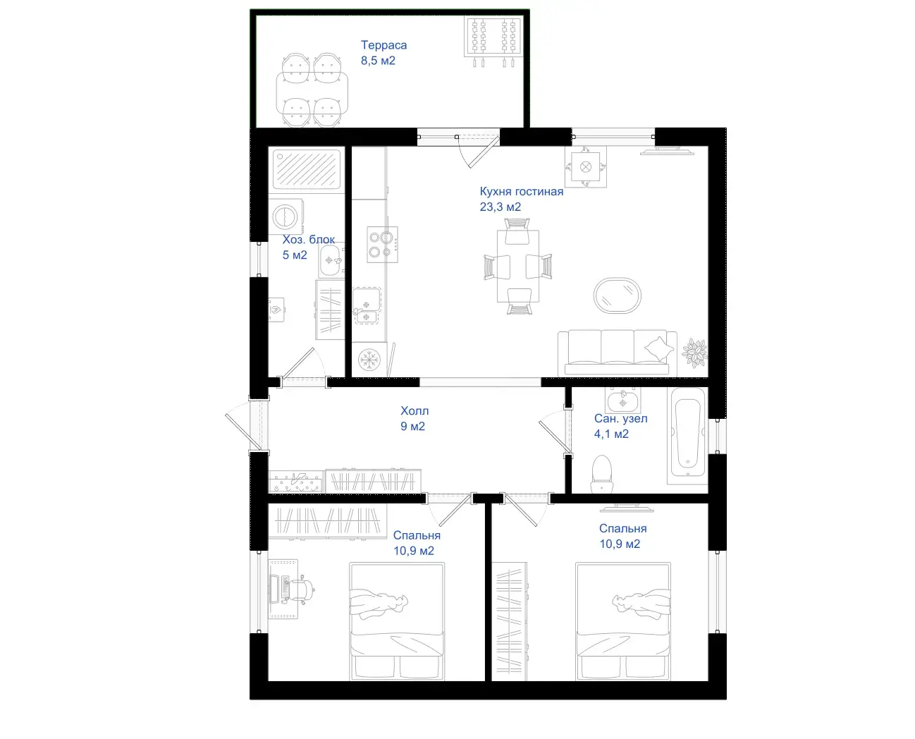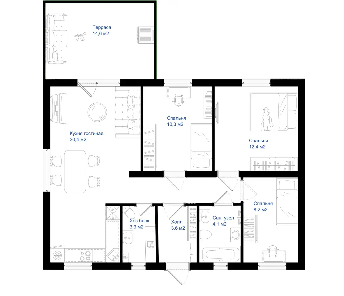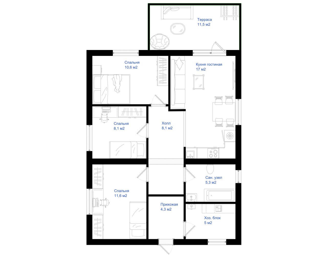 Проект Берёзка Общая площадь: 88 м² Жилая площадь:61,3 м² Размер дома: 8,0 х 11 Высота потолка: 2,8 м Фундамент: плита Конструктив стен: несъемная опалубка 300 мм Утепление: внутреннее 50 мм внешнее 100 мм Толщина бетона: 150 мм Фасад: декоративная штукатурка (мокрый фасад)