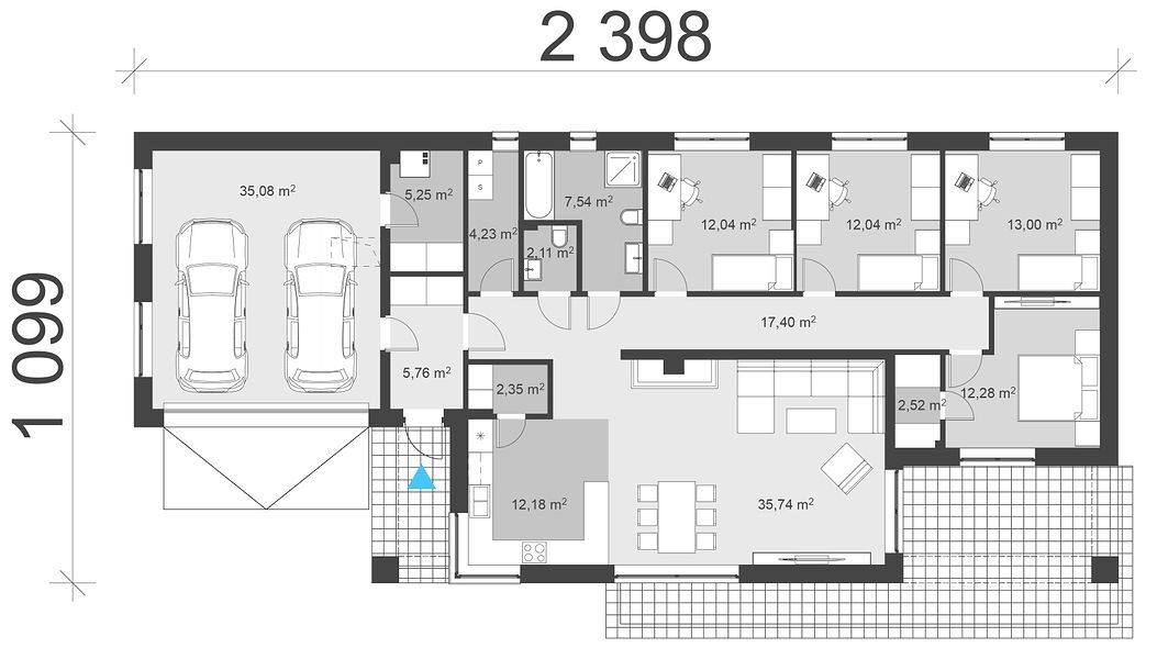 Проект Семейный Общая площадь: 62.5 м² Жилая площадь: 50 м² Размер дома: 12.5 х 5 Высота потолка: 2,8 м Фундамент: плита Конструктив стен: несъемная опалубка 300 мм Утепление: внутреннее 50 мм внешнее 100 мм Толщина бетона: 150 мм Фасад: декоративная штукатурка (мокрый фасад)