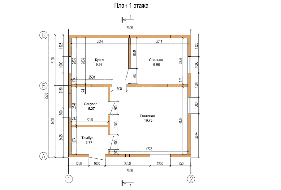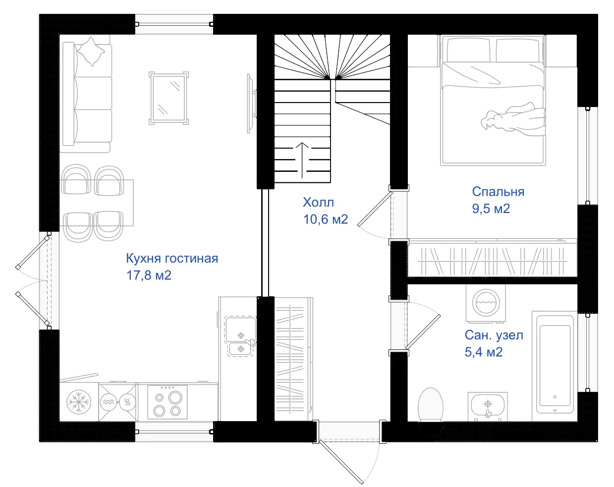 Проект Обь Общая площадь: 56 м² Жилая площадь:45,3 м² Размер дома: 7,5 х 7,5 Высота потолка: 2,8 м Фундамент: плита Конструктив стен: несъемная опалубка 300 мм Утепление: внутреннее 50 мм внешнее 100 мм Толщина бетона: 150 мм Фасад: декоративная штукатурка (мокрый фасад)