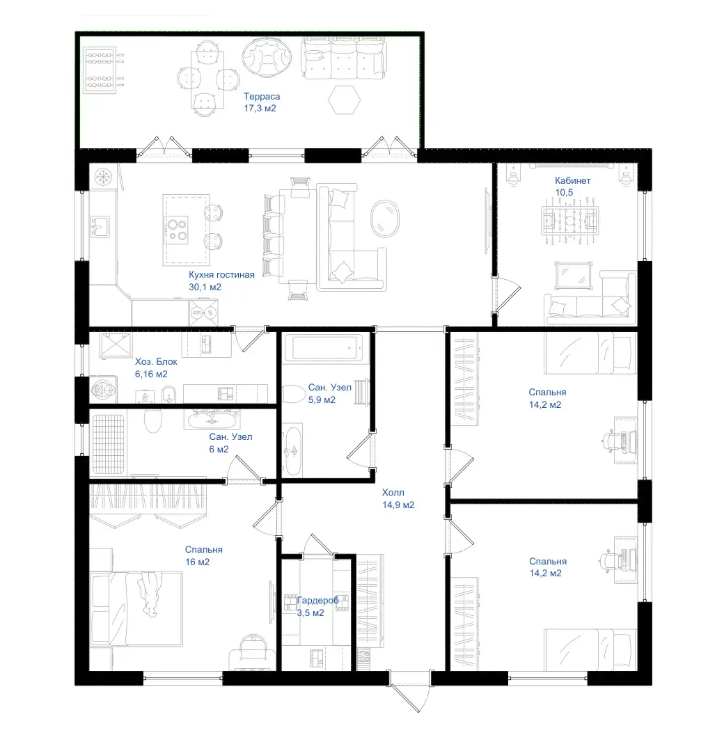 Версаль Общая площадь: 200 м² Жилая площадь: 145 м² Размер дома: 11 х 24 Высота потолка: 2,8 м Фундамент: плита Конструктив стен: несъемная опалубка 300 мм Утепление: внутреннее 50 мм внешнее 100 мм Толщина бетона: 150 мм Фасад: декоративная штукатурка (мокрый фасад)